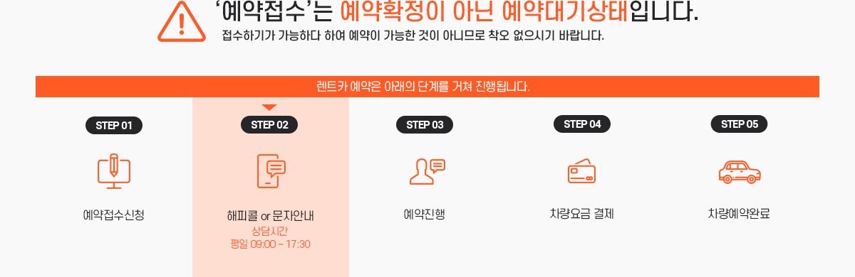 예약상담 접수후 담당자가 업무시간중 유선 혹은 문자발송으로 예약 가능여부등을 안내하며, 예약금 혹은 차량료가 "결제완료" 되기 전까지는 예약확정이 아님을 안내 해 드립니다.
